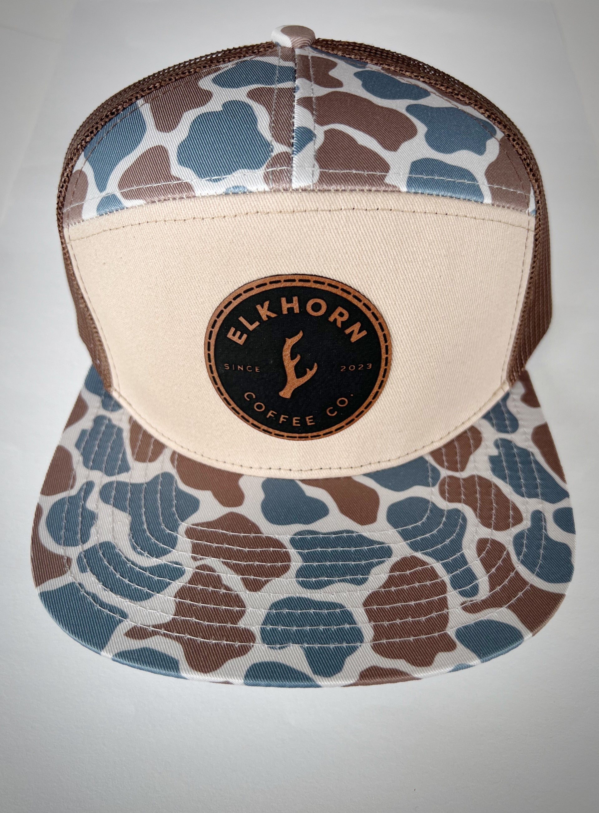 Wear this stylish Duck Camo Elkhorn hat the next time you're in the blind hunting for ducks or geese or just enjoying a nice day out on the water fishing. Has the Elkhorn Coffee Logo with our iconic antler E on a black and brown leather patch.